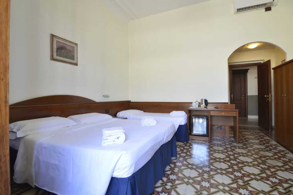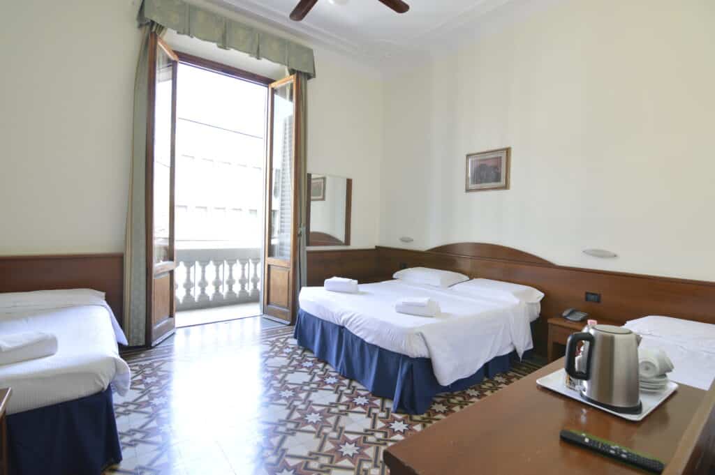 La Camera Quadrupla è la scelta ideale per famiglie o gruppi che desiderano un soggiorno confortevole e funzionale nel cuore di Firenze. Con una superficie di 23 mq, questa spaziosa camera offre un letto matrimoniale e due letti singoli.