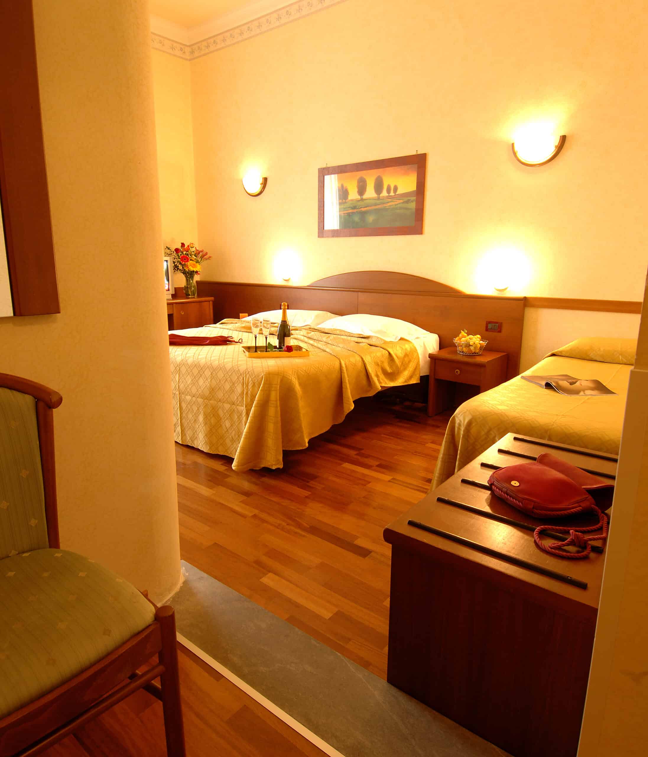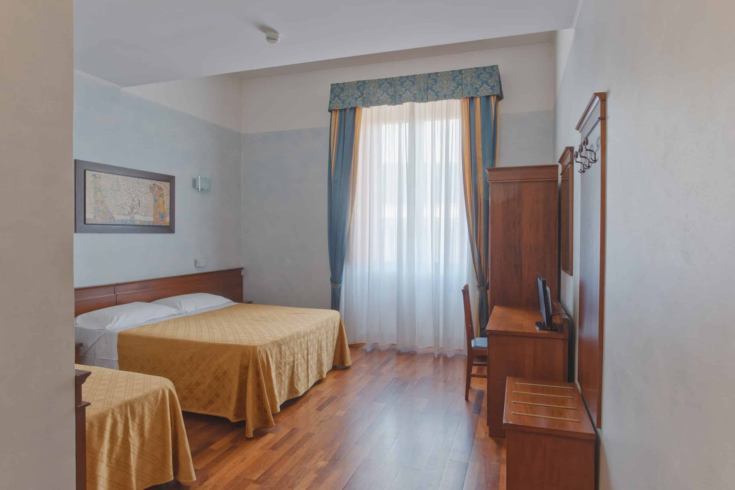 Arredi funzionali e pavimenti in parquet creano un ambiente accogliente. dispone di ampie finestre che si affacciano sulla strada o sul cortile interno dell’hotel, garantendo luminosità e tranquillità. Il bagno privato è dotato di doccia, bidet, asciugacapelli, prodotti da bagno e asciugamani.