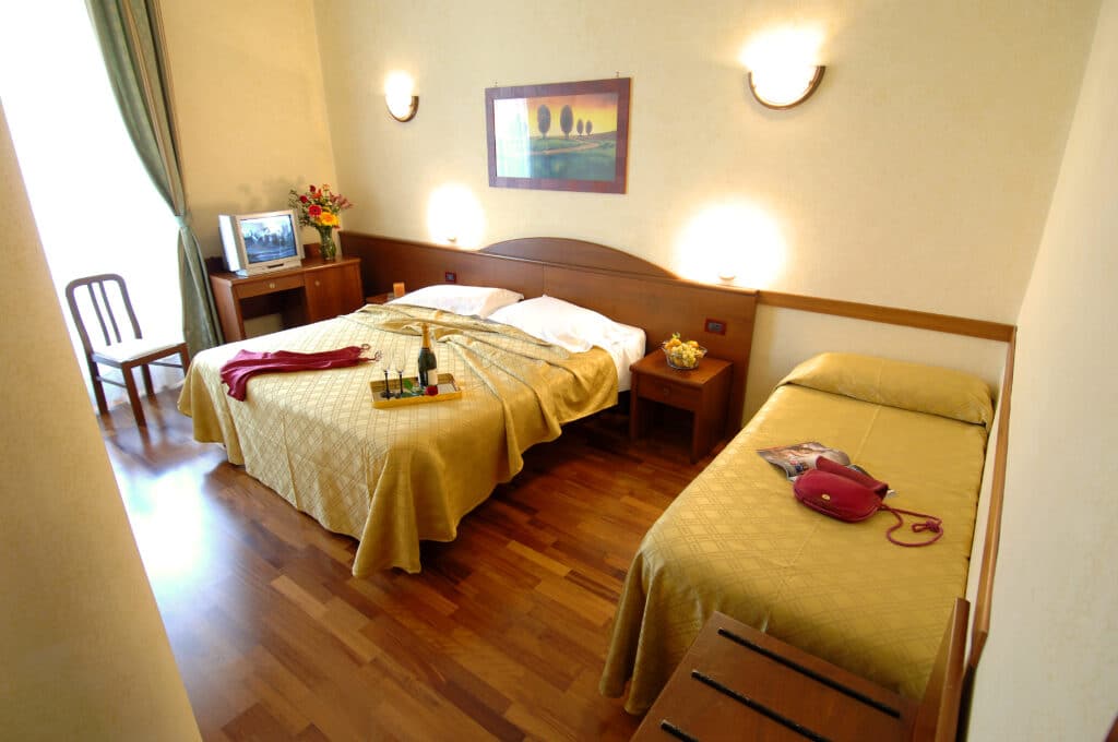 Arredi funzionali e pavimenti in parquet creano un ambiente accogliente. dispone di ampie finestre che si affacciano sulla strada o sul cortile interno dell’hotel, garantendo luminosità e tranquillità. Il bagno privato è dotato di doccia, bidet, asciugacapelli, prodotti da bagno e asciugamani.
