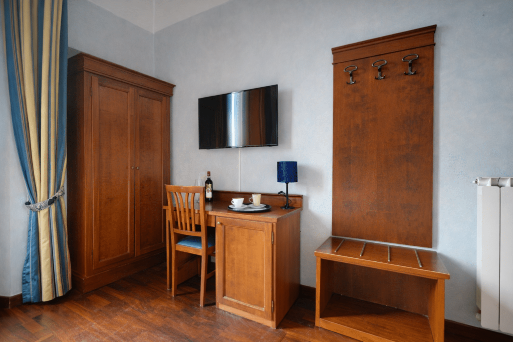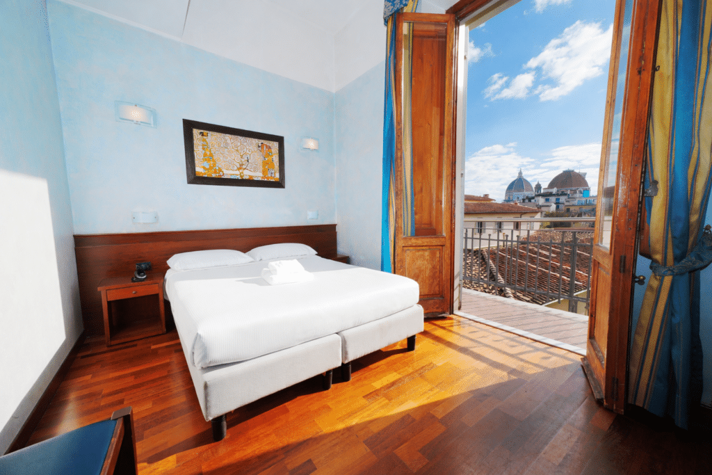 Indulge in an unforgettable stay with stunning views of Florence’s historic landmarks. Our Double Room with View offers 16 sqm of bright, elegant space with a private balcony overlooking Brunelleschi’s Dome and the Church of San Lorenzo.